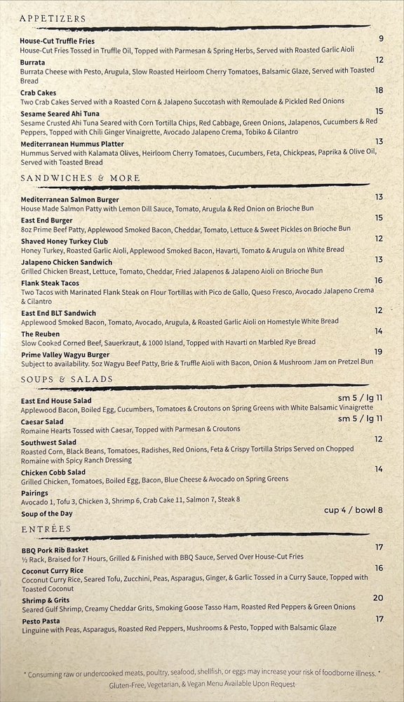Welcome to East End Grill, a vibrant New American bar located in the heart of Lafayette, Indiana. This trendy eatery offers a diverse menu that caters to all palates, featuring an array of vegan and vegetarian options alongside delicious meat dishes. The atmosphere is casual yet lively, making it an ideal spot for lunch or dinner with friends and family.